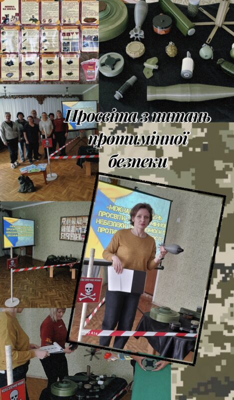 Опис: До Міжнародного дня просвіти з питань мінної безпеки було проведено тренінг з колективом дошкільного закладу щодо дій у випадку виявлення міни або вибухонебезпечних предметів, а також ознайомлення з основними заходами допомоги та поведінкою у разі надвичайної ситуації. Важливою частиною заходу стала інтерактивна бесіда з демонстрацією повномаштабних муляжів вибухонебепечних предметів, які мають ознаки потенційної небезпеки. Працівники закладу дошкільної освіти отримали рекомендації та пам'ятки щодо дій під час виявлення підозрілого предмета.