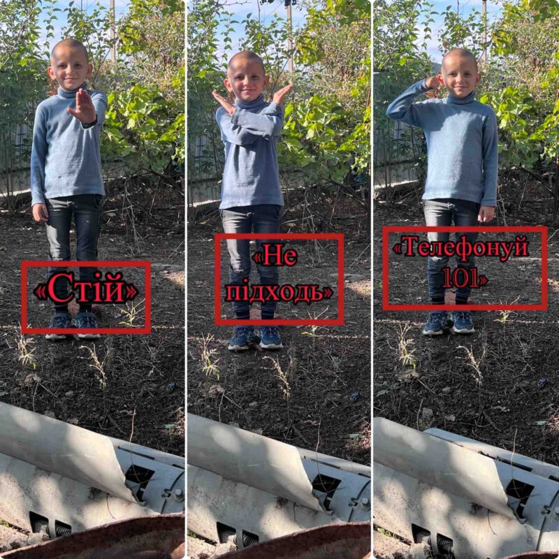 Опис: На фото дитина демонструє три важливі правила поведінки, якщо знайдено незнайомий або підозрілий предмет: