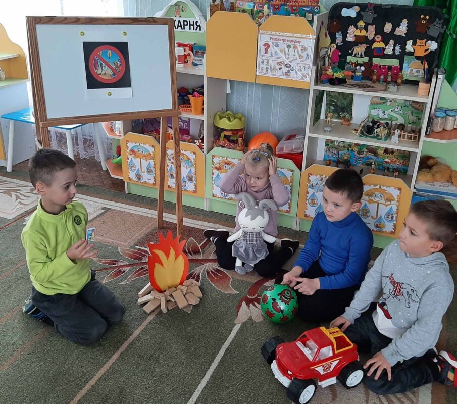 Опис: На фото — чотири дошкільники в сюжетно-рольовій грі. Один із них тримає сірники, граючись, не усвідомлюючи небезпеку. Поруч — дівчинка з тривожним виразом обличчя, тримається за голову, ніби намагається зупинити небезпечну гру. На мольберті знак —"Сірники — не іграшка!". Сцена демонструє важливість раннього формування навичок безпечної поведінки, вміння розпізнавати загрозу та реагувати відповідально. Гра стає інструментом навчання, де діти вчаться не лише діяти, а й співпереживати.