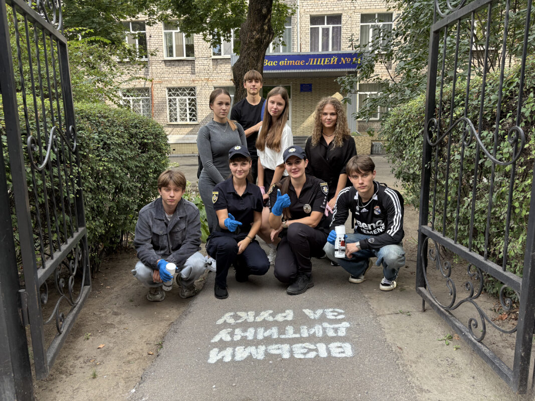 Опис: Здобувачі освіти разом з педагогами закладу та офіцером Служби освітньої безпеки біля ліцею організували акцію «Візьми дитину за руку». Перед виходами зі школи вони нанесли яскраве нагадування з написом «Візьми дитину за руку». Це просте, але надзвичайно важливе звернення має на меті наголосити дорослим, які супроводжують дітей до школи чи дитячого садка: безпека дитини на дорозі починається з відповідальності дорослого.