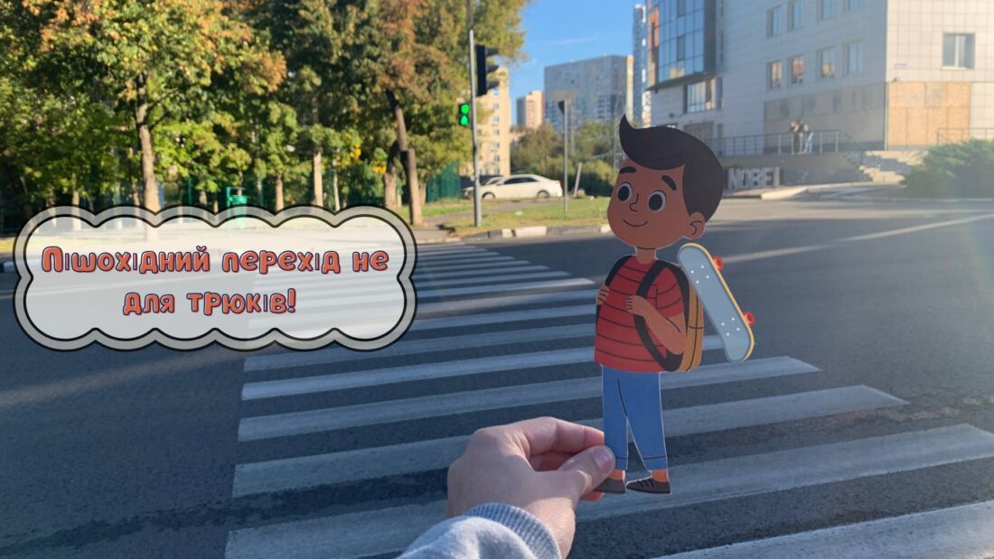 Хлопчик показує приклад безпечної поведінки – пішохідний перехід призначений для ходьби, а не для катання.