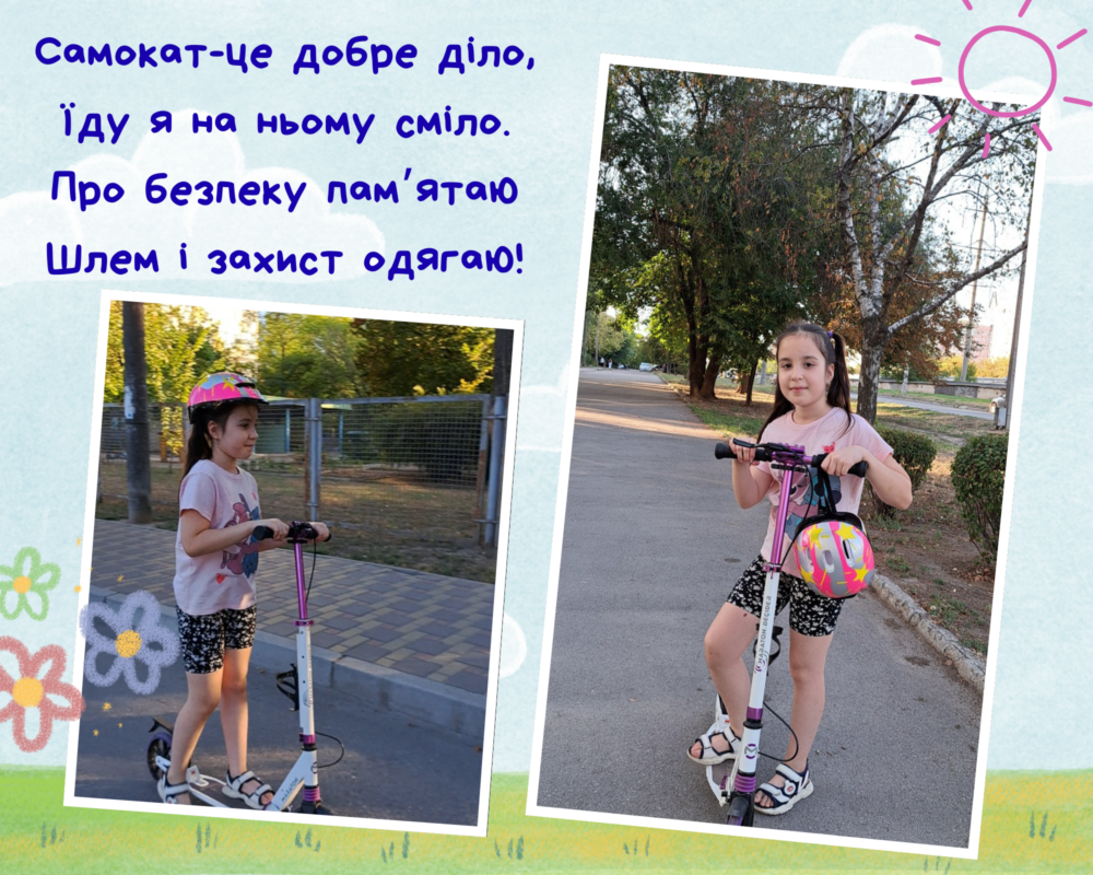 Опис: Катання на самокаті приносить багато радості, але воно може бути небезпечним без дотримання правил. Найголвніше - завжди одягати захисні елементи. Вони захищають від травм у разі падіння. Також важливо дивитись вперед, тримати руки а кермі та їздити лише у безпечних місцях. Дотримання цих правил робить рух на самокаті цікавим і безпечним.