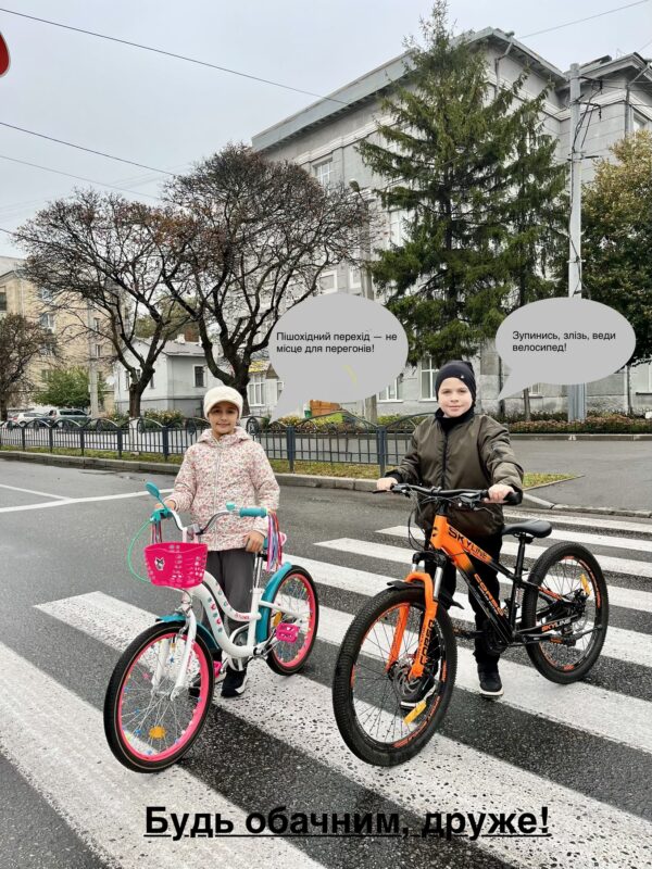 Пішохідний перехід- не місце для перегонів! Зупинись, злізь, веди велосипед! Будь обачним, друже!!!