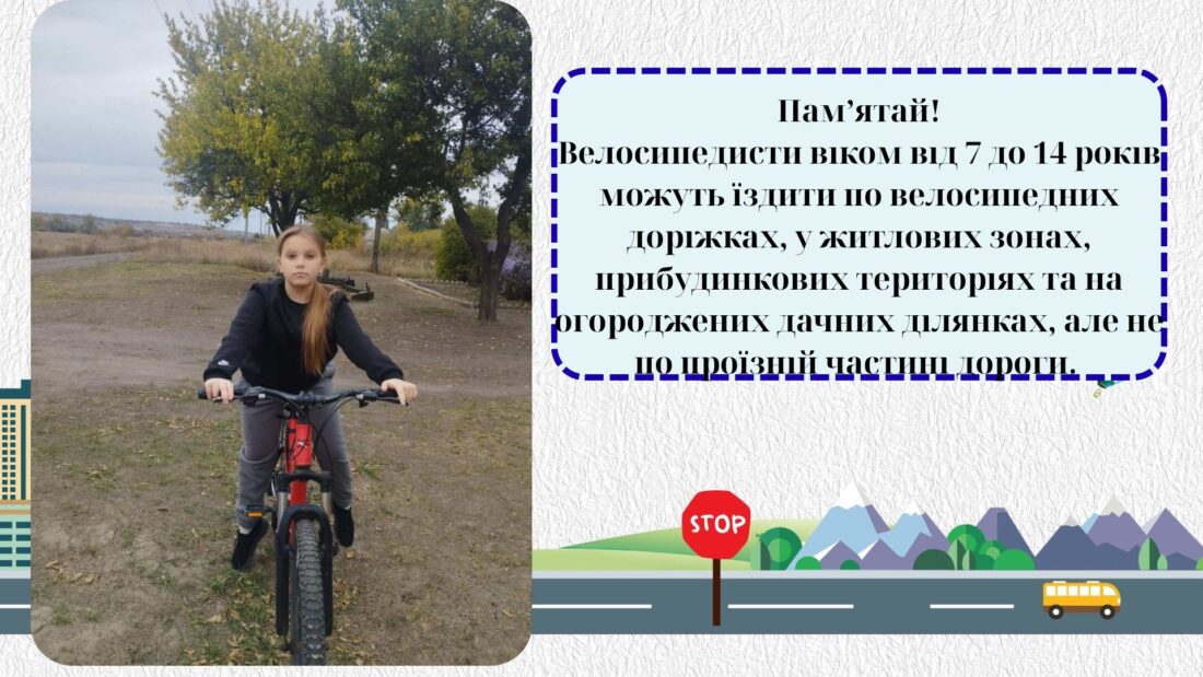 Пам’ятай! Велосипедисти віком від 7 до 14 років можуть їздити по велосипедних доріжках, у житлових зонах, прибудинкових територіях та на огороджених дачних ділянках, але не по проїзній частині дороги.